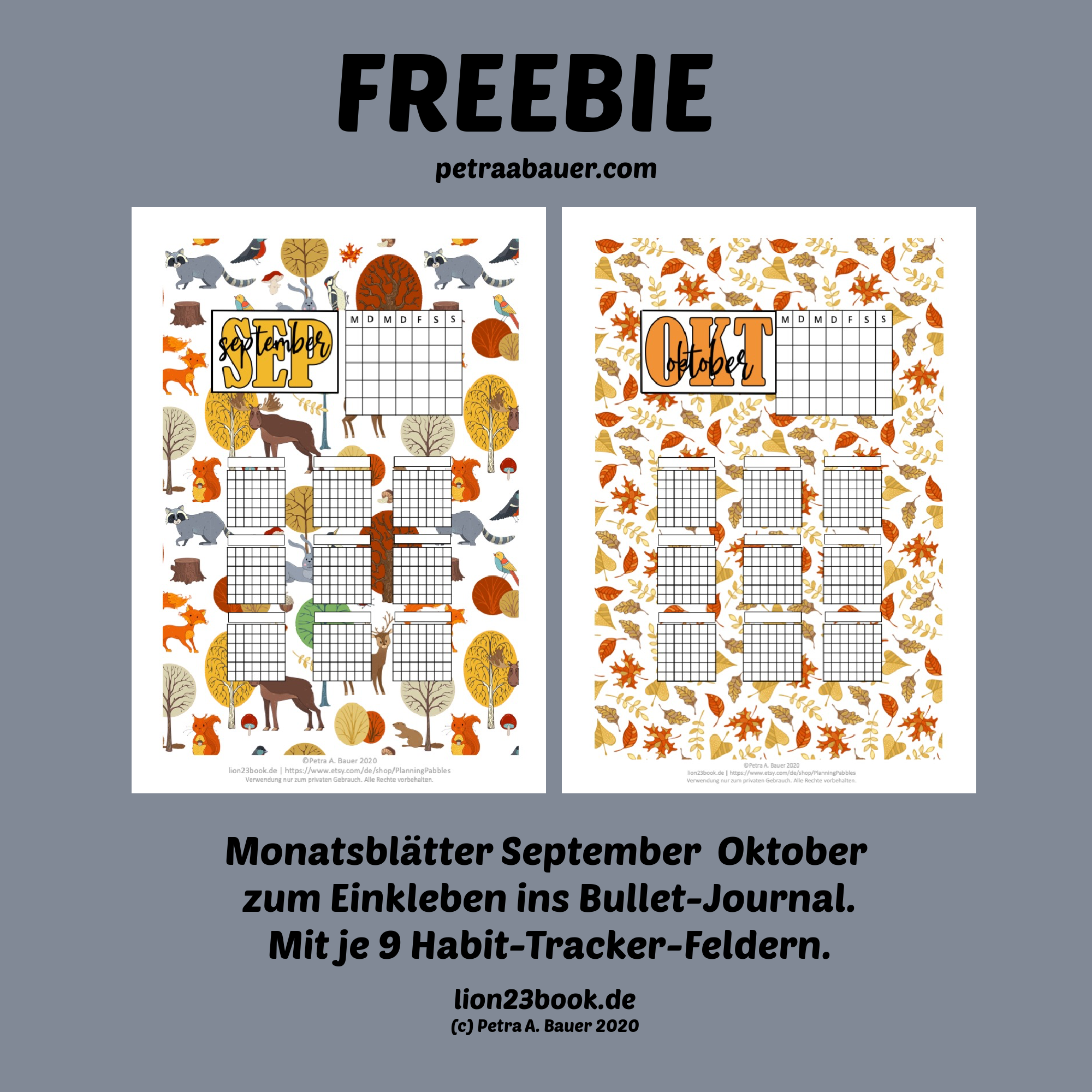 Das September-Freebie für meine Newsletter-Abonnenten ist ein PDF mit zwei Monatsblättern (September und Oktober) mit 9 Habit-Tracker-Tabellen, und zwar in drei Versionen: