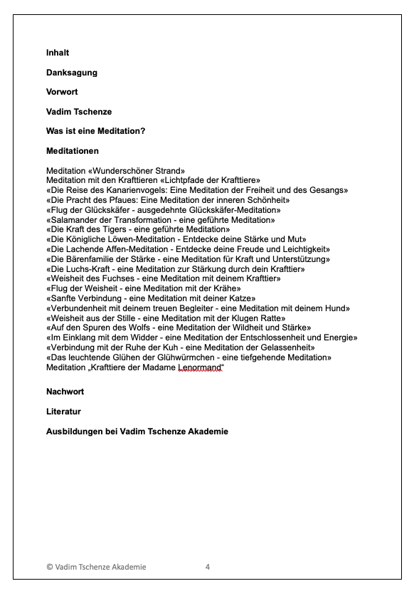 In diesem Buch findest du eine Vielzahl von geführten Meditationen, die dich auf eine Reise zu deinen inneren Kräften und zu deinen Krafttieren mitnehmen. Du wirst lernen, wie du dich auf diese Reisen vorbereitest und wie du die Botschaften deiner Krafttiere verstehen und nutzen kannst.