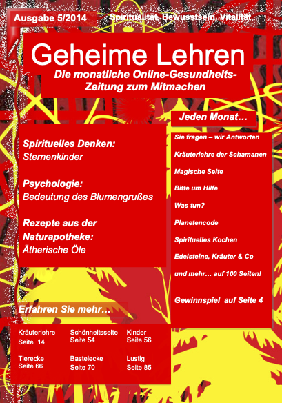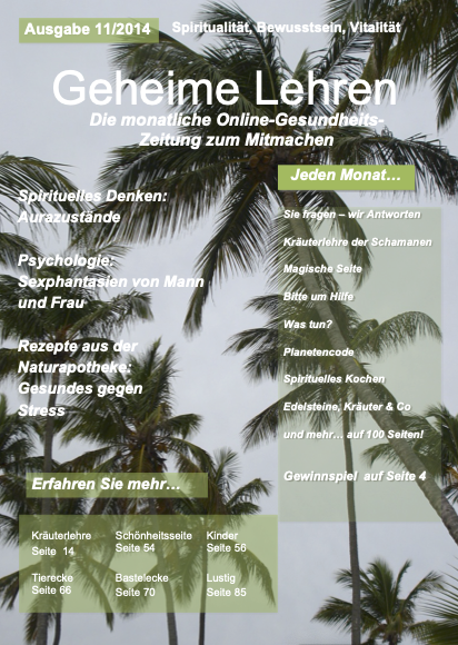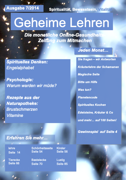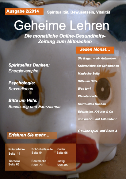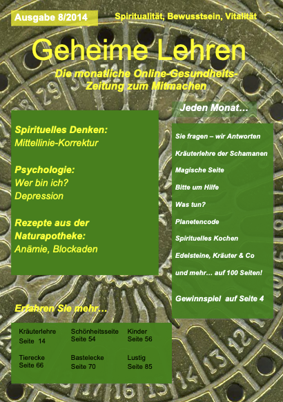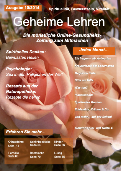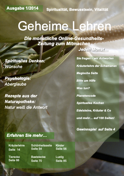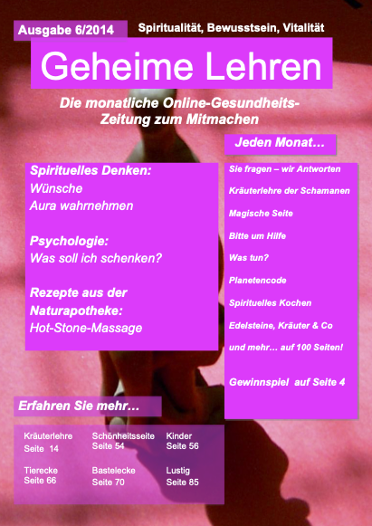 ich verwende in meiner Arbeit als spiritueller Therapeut und Geistheiler bereits seit vielen Jahren altes Wissen aus dem Schatz des russischen Schamanismus und der russischen weißen Magie zur Genesung meiner Klienten, und ich freue mich, Ihnen all dies nun auch als Zeitschrift vorlegen zu können. Man kann sein eigenes Leben und Karma beeinflussen und ein positives Leben erreichen, wenn man weiß, wie man Negatives verarbeitet, bis nichts mehr stört. Dann wird man seine eigenen persönlichen Wege finden, die einen zu Lebendigkeit, Stärke, Erfolg und Gesundheit führen! In dieser monatlichen Zeitschrift finden Sie das neue Wissen aus der Naturmedizin, Energiearbeit, Selbsthilfe, Psychologie, Spiritualität, Heilung, Schönheit und vieles mehr. Auch das alte geheime Wissen der Schamanen findet seinen Platz in unserer 100-seitigen Onlinezeitschrift. Eine gelungene Mischung aus dem geheimen Wissen der ganzen Welt wartet auf Sie.