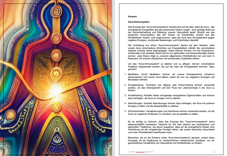 In diesem Kapitel lernen wir, die Aura wahrzunehmen und ihre Farben und Schwingungen zu interpretieren. Durch ein besseres Verständnis unserer Aura können wir erkennen, wie wir uns fühlen und wie andere uns wahrnehmen. Wir entdecken, wie wir unsere Aura stärken und vor negativen Einflüssen schützen können.