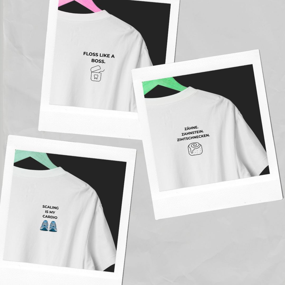 Ob FLOSS LIKE A BOSS ( ACHTUNG: aktuelle leider ausverkauft ) , ZÄHNE. ZAHNSTEIN. ZIMTSCHNECKEN. oder SCALING IS MY CARDIO – diese limitierten Statement-Shirts sind mehr als nur Stoff.